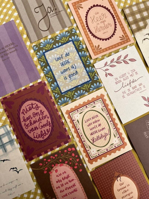 De kaarten zijn gedrukt op stevig gerecycled papier, waarbij de gerecyclede suikerrietvezel het papier een mooie, natuurlijke en zachte uitstraling geeft.